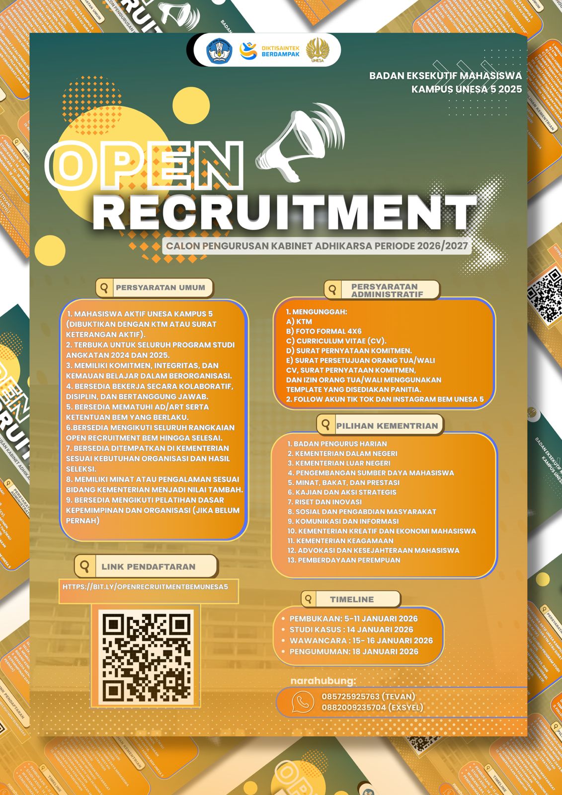 Badan Eksekutif Mahasiswa (BEM) Universitas Negeri Surabaya (UNESA) Kampus 5 resmi membuka Open Recruitment Calon Pengurus Kabinet Adhikarsa periode 2026/2027. Kegiatan ini d