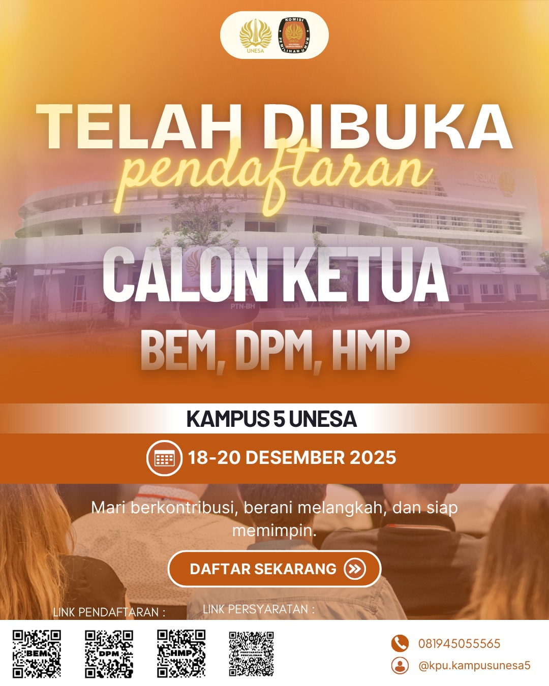 Komisi Pemilihan Umum (KPU) Kampus 5 Universitas Negeri Surabaya (UNESA) resmi membuka pendaftaran calon ketua dan wakil ketua Badan Eksekutif Mahasiswa
